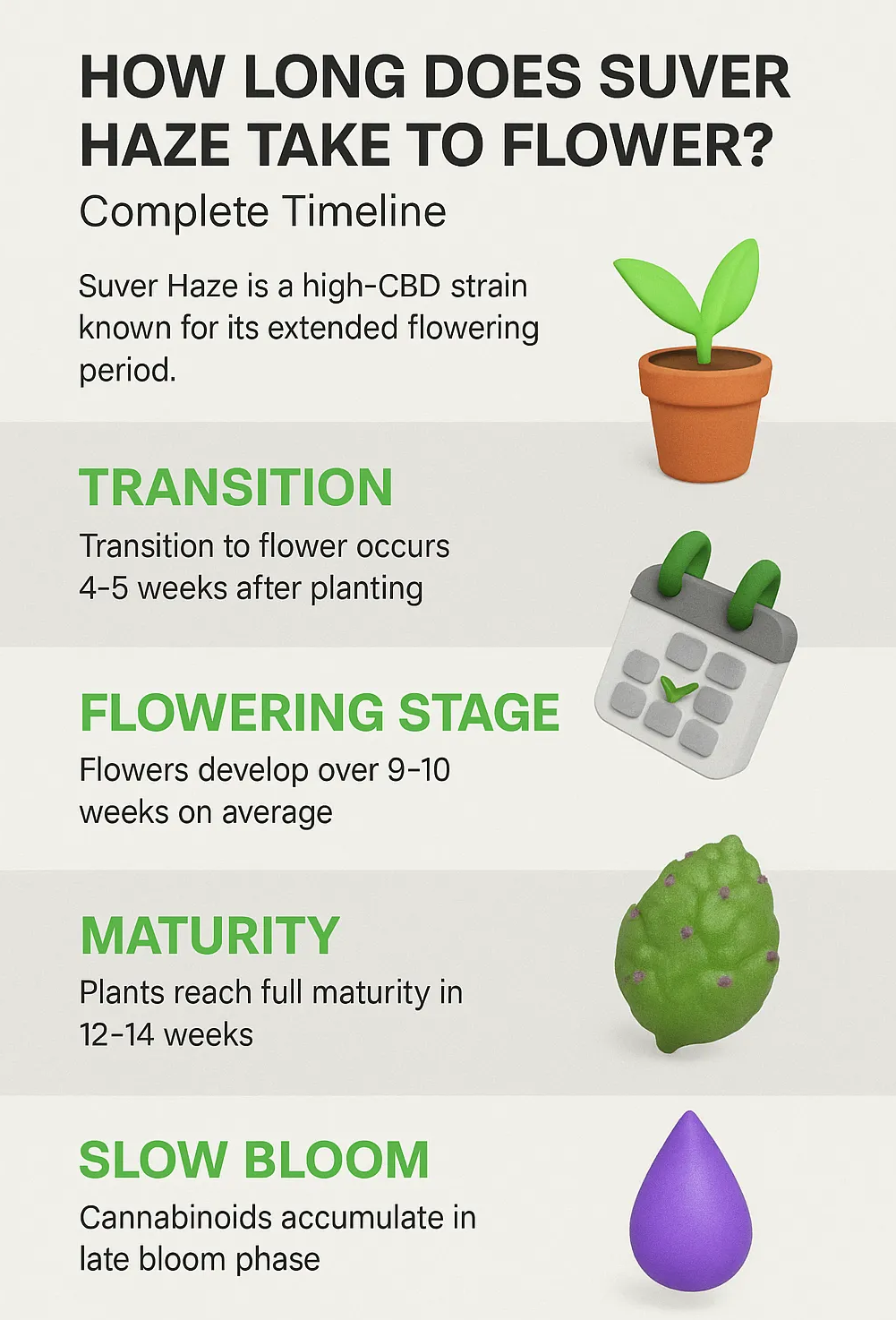 This guide provides a complete, experience-backed timeline of Suver Haze CBD strain and seed flowering phase — from seedling emergence to harvest readiness. It highlights the key developmental milestones, early visual cues, and proven cultivation adjustments that maximize resin production and flavor. Whether starting from feminized Suver Haze seeds or stabilized clones, readers will gain a clear, research-informed understanding of how long Suver Haze takes to flower — and how to ensure each grow reaches its full genetic potential.
