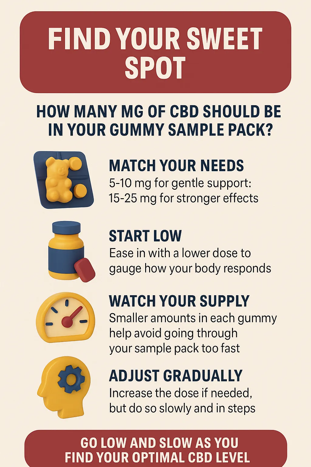 For most sample packs, 5–25 mg of CBD per gummy is considered the sweet spot. Lower strengths, such as 5–10 mg, are ideal for beginners who want to test how their body responds without overwhelming effects. Moderate doses around 15–25 mg per gummy tend to work best for those seeking noticeable relaxation, focus, or recovery benefits.